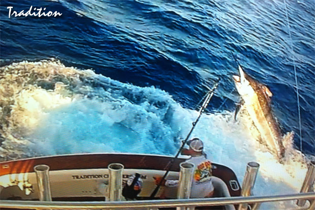 Wandering north, I heard a bit of a lunchtime bite happening on big fish for three boats fishing together in the Middle Ribbons on Capt. Tim Richardson’s Tradition, Capt. Hayden Bell’s Release and Capt. Ross Finlayson’s Top Shot. They all hooked up to 800lb model fish within 5 minutes of each other, all for successful releases. But the day didn’t end there for Capt. Tim’s team on Tradition. Overall he saw 9 fish, raised 6 and had 4 bites finishing the day with three big fish including the 800 as well as a 700 and 750lb, 2 caught on lures on the shotgun! Tim says they had some great bites and the bigger fish went off down sea ripping off 300 yards of line like it was nothing. A pretty awesome day’s fishing! (Photo top and below.)