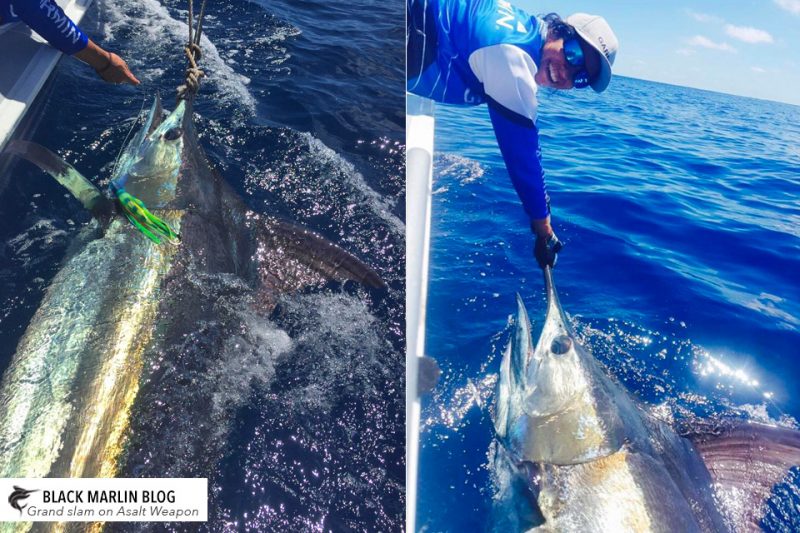 What a great way to notch up your first blue marlin by finishing with a Grand Slam! Fishing with Luke Bell and Ryan Morgan off the central coast on Asalt Weapon Sharleen Agudelo got her first blue and also and ticked off the teams first grand slam starting with the blue (nice one with a 2.96m short length @ 200+kg) then they went inside the shelf to find a stripe and finished off with a black. Great result also for Sharleen in only her second season game fishing!